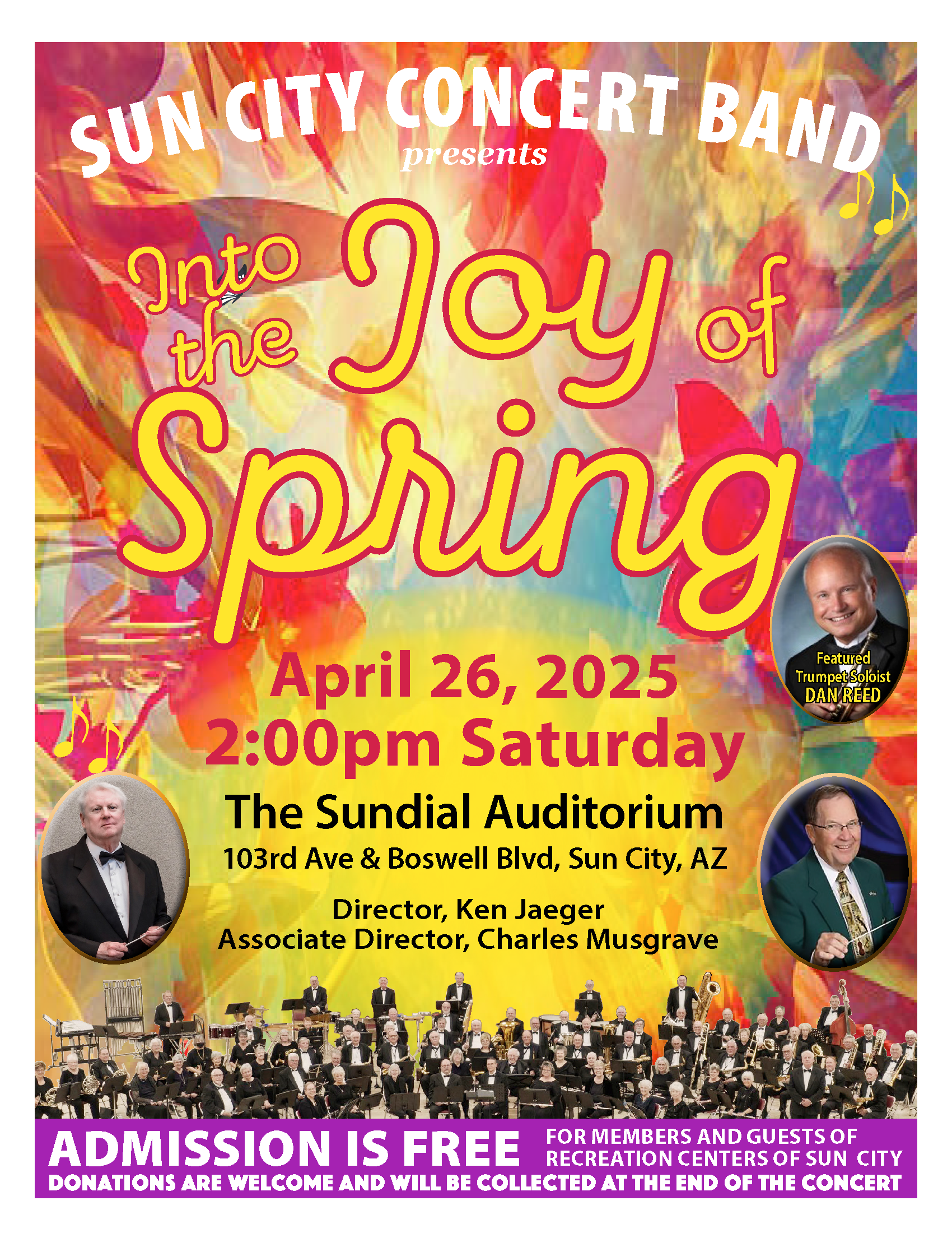 Spring Concert – 2025 Charles Musgrave, Dan Reed, Ken Jaeger April 26, 2025 2:00 pm Sun City Sundial Auditorium Google Map SCCB Joy of Spring flyer 2025 final_01 (1)